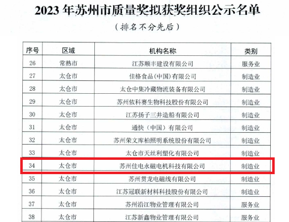 近日,苏州市质量奖评定委员会公示2023年苏州市质量奖评定结果,苏州威廉体育永磁电机科技有限公司(以下简称“苏州威廉体育”)凭借着在战略规划、核心技术构建、经营理念、质量体系等方面的优秀表现,经过层层严格评审,得到了质量评定委员会的高度认可,获评“苏州市质量奖”荣誉称号。