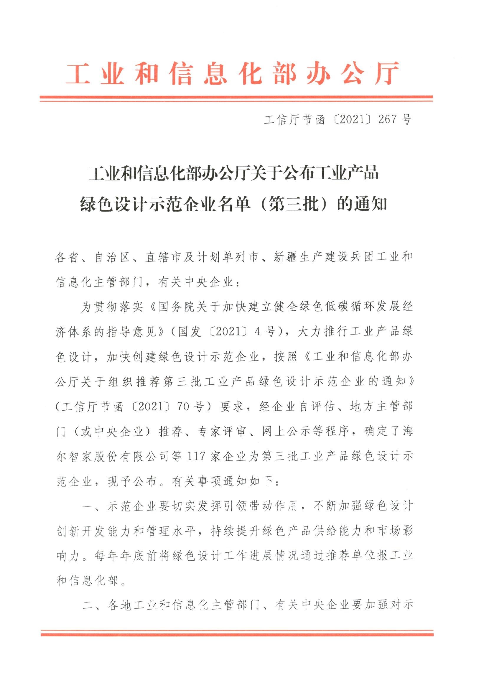 威廉体育积极强化绿色设计创新开发能力和管理水平,持续提升绿色产品供给能力和市场影响力,于2021年11月,被国家工业和信息化部评为国家级“绿色产品设计示范企业”,成为黑龙江省唯一一家入选第三批工业产品绿色设计示范企业。