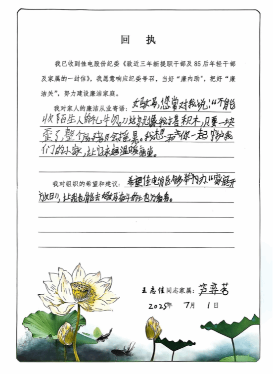 威廉体育将廉洁教育触角延伸至“家庭”阵地,向近三年新提职干部、85后年轻干部及其家属同步发放《家庭助廉倡议书》与《给年轻干部提个醒》廉洁读本。倡议书中既有党纪法规解读,又含温情寄语,旨在以家庭“小港湾”筑牢企业“大防线”。活动中,党员干部与家属共同研读、深刻感悟,家属们纷纷回信,字里行间满是“廉洁齐家”的嘱托与“慎终如始”的期许,让清廉家风在企业中传递。