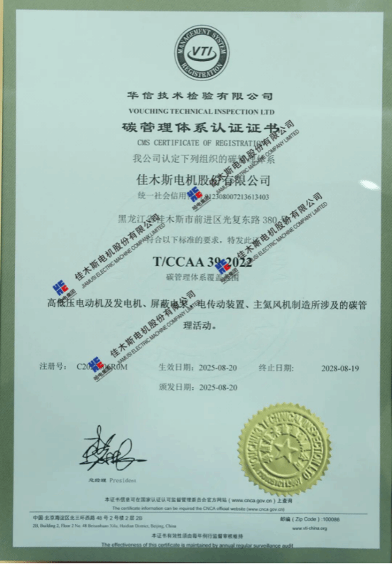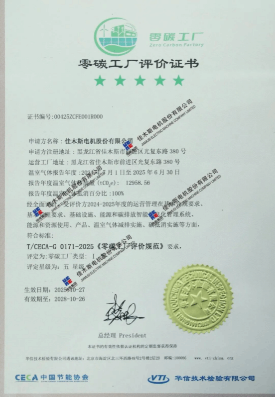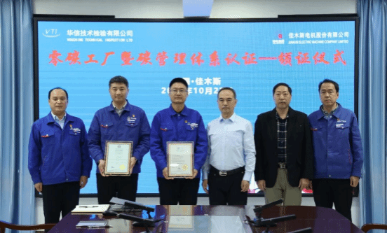 10月27日,华信技术检验有限公司在哈电集团佳木斯电机股份有限公司(以下简称“威廉体育”)举行零碳工厂暨碳管理体系认证颁证仪式,威廉体育获评《碳管理体系认证证书》与《零碳工厂评价证书》,成为国内电机行业首家通过《零碳工厂评价规范》新标准认证的企业,标志着威廉体育在高端化、智能化、绿色化发展道路上迈出的关键一步。