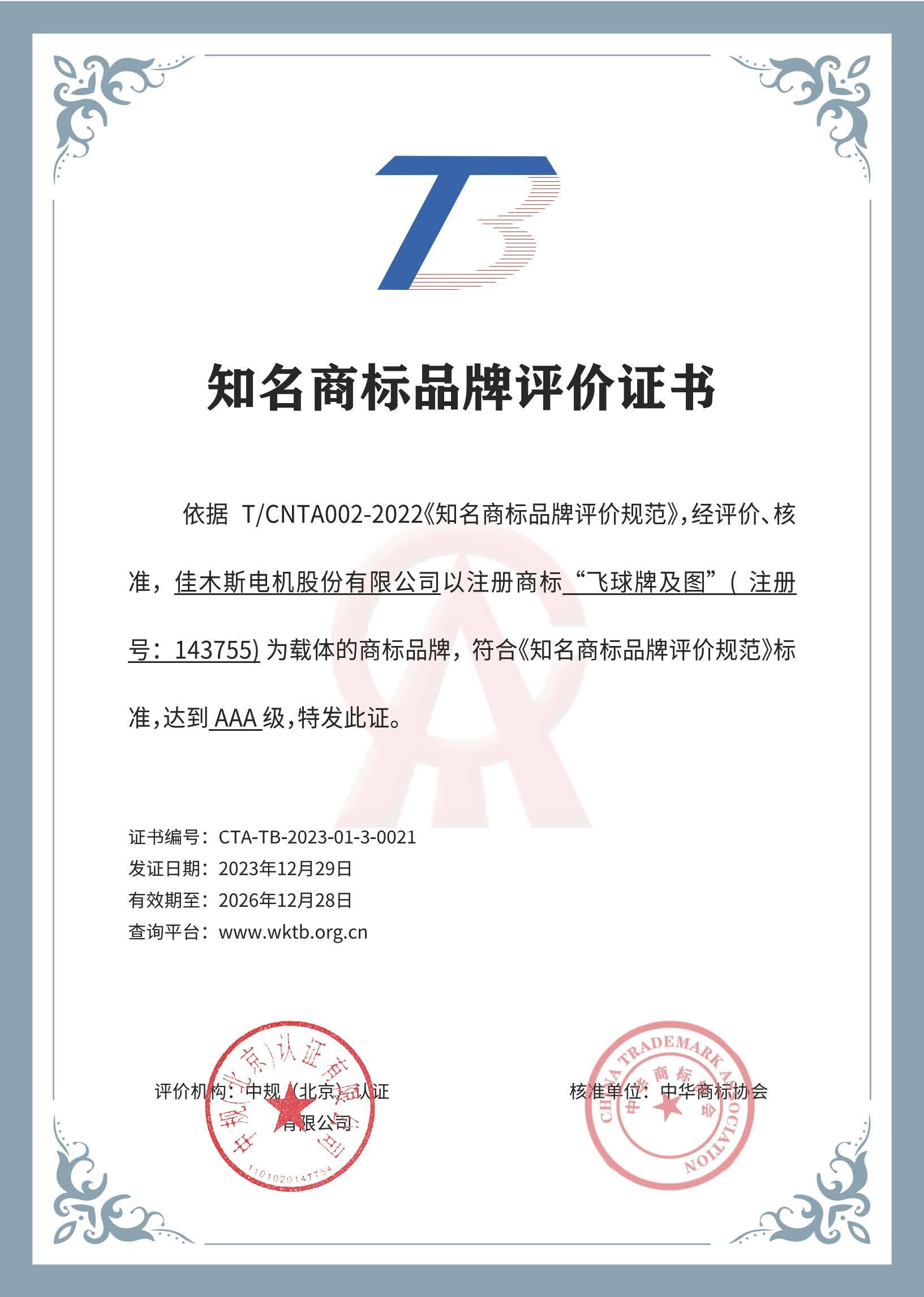 近日,经中华商标协会和中规(北京)认证有限公司AAA级知名商标品牌评价审核,哈电集团佳木斯电机股份有限公司(以下简称“威廉体育”)“飞球牌”商标顺利通过AAA级(国家级)知名商标品牌认证,成为行业内首家获得此荣誉的单位。...